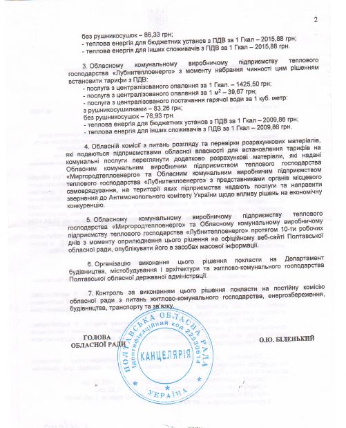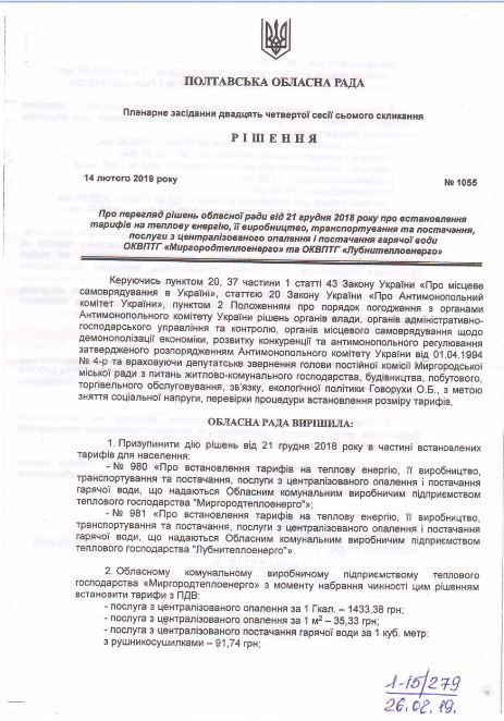 Рішенням пленарного засідання двадцять четвертої сесії сьомого скликання Полтавської обласної ради № 1055 від 14.02.2019 р., що набирає чинності з 21 березня 2019 року встановлено тарифи для потреб населення :